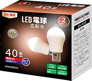 LED 電球 调光器対応 クリプトン電球40w E17口金 40形 510lm 電球色 相当広配光タイプ 小形電球 断熱材器具対応 密閉器具対応 2個入( 電球色)